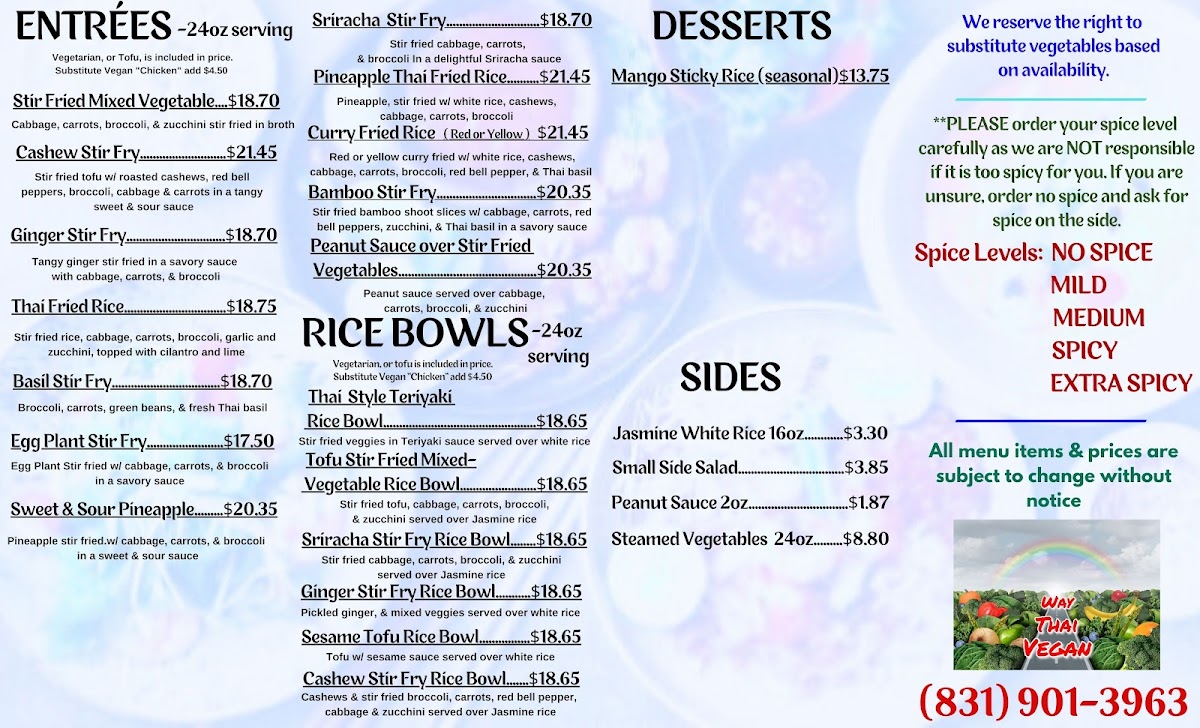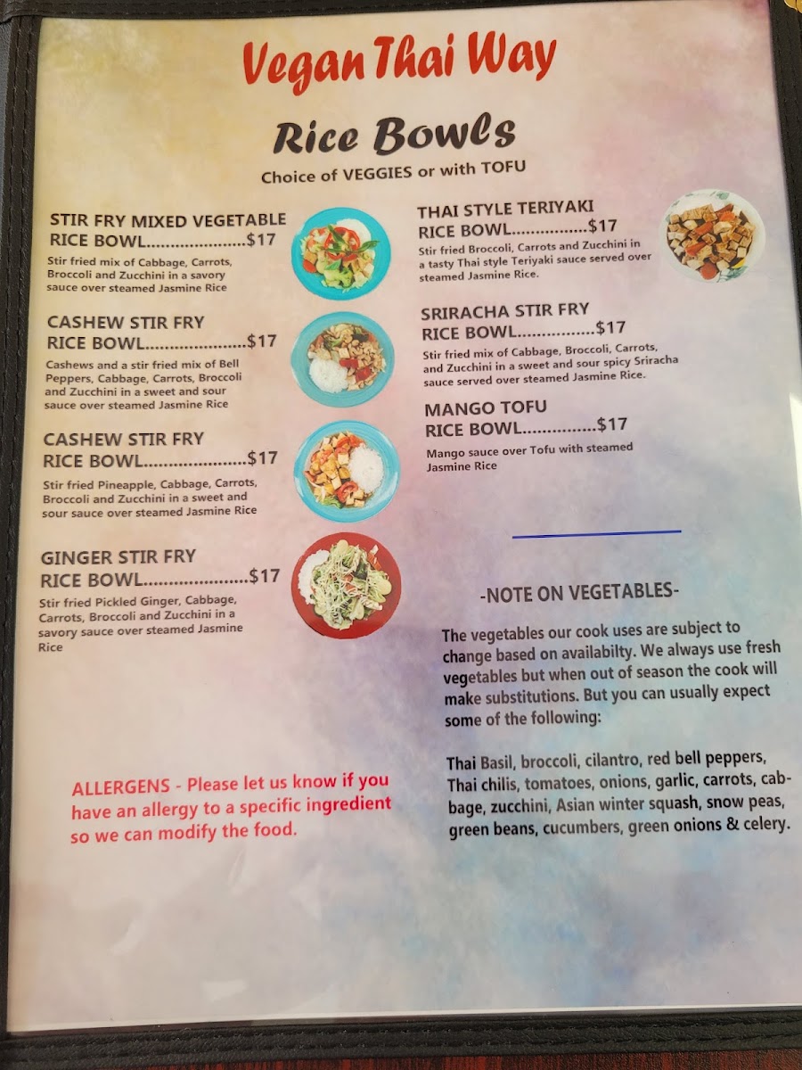 Vegan Thai Style Teriyaki Rice Bowl -24oz portion -Choice of Vegan "Chicken", veggie only or with Tofu, stir fried broccoli, carrots, and zucchini in a savory Thai style Teriyaki sauce served over steamed Jasmine white rice