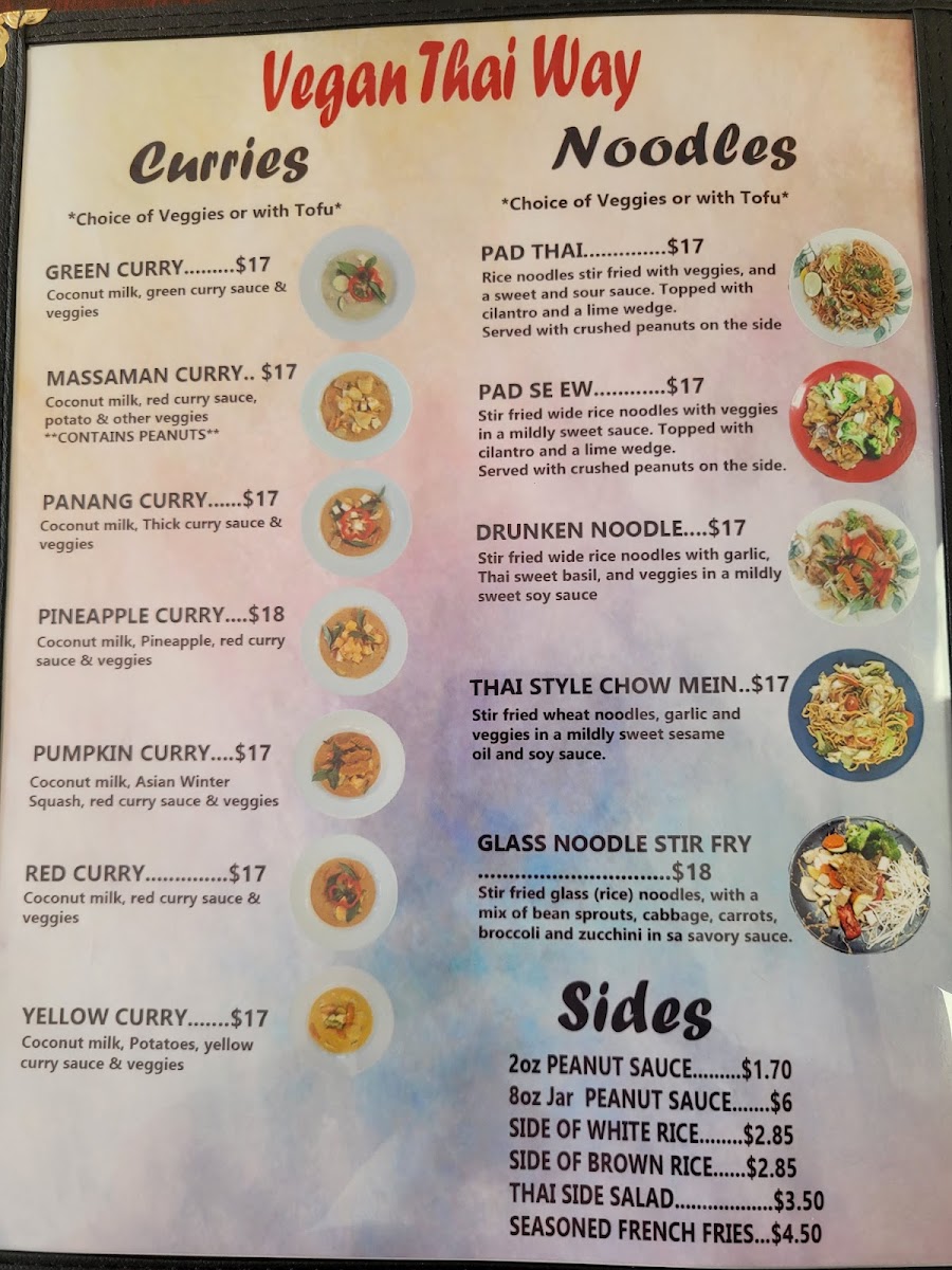 Vegan Pad Thai -24oz portion -Choice of Vegan " Chicken", veggie only or with Tofu, rice noodles and a mix of cabbage, shredded carrots, and bean sprouts in a sweet and sour sauce and topped with cilantro and lime with crushed peanuts on the side